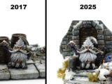 Une figurine que je suis très heureux d’avoir enfin peinte après toutes les années où elle a habité mon imaginaire. Ne l’ayant acquis qu’en 2016, un peu avant l’arrivée de la nouvelle version, j’avais ce modèle en stock dans sa version Finecast (quelle horreur cette résine, déformée par endroits et pleines de problèmes de moulage qu’il a fallu reprendre à la green stuff). Pour son socle, j’ai voulu le baigner au milieu de nombreux fragments de malepierre que le Démon accumulait durant sa campagne de Mordheim. Cette malepierre a été réalisée de la même manière que des pions (que je m’aperçois ne vous avoir jamais présenté) en suivant la méthode de Gregauryc. Un petit peu d’OSL que les pattes et la queue et le tour était joué.