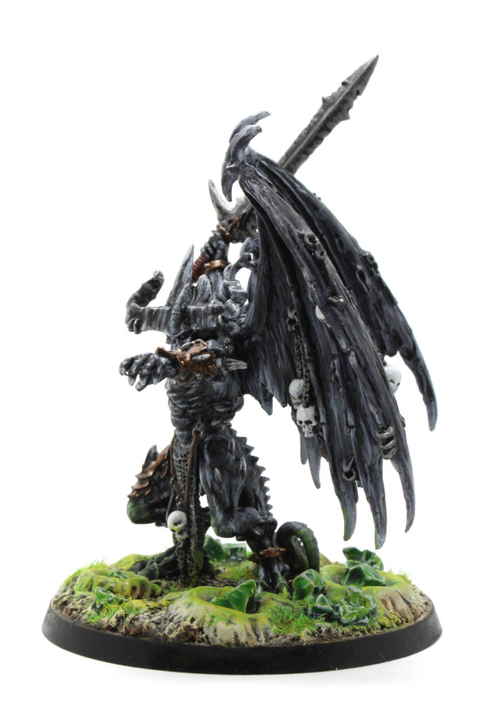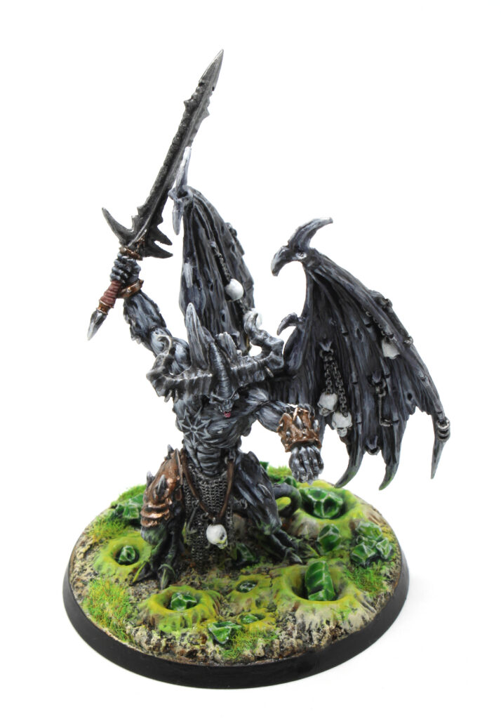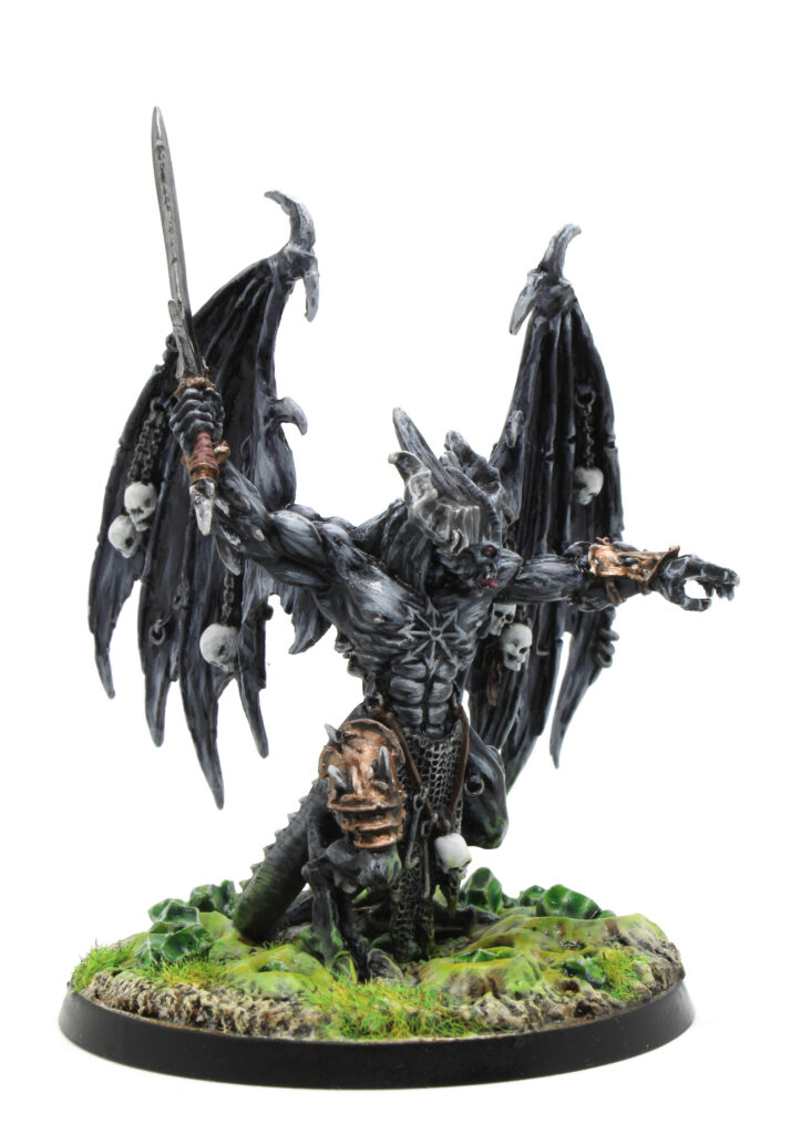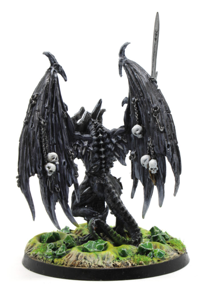 Cette figurine est sortie à l’époque de la V6 de Warhammer Battle, en 2005, lors de la campagne d’Albion durant laquelle Be’lakor a, à nouveau, comploté pour obtenir un corps physique et tenté de s’emparer de la Couronne de Domination, malgré son échec lors des évènements de Mordheim. Un sculpture superbe, qui a accompagné mon adolescence et que je préfère nettement à la version moderne (mon côté oldhammer peut-être ?) que je trouve trop grande, et aux ailes trop imposantes, noyant le personnage lui-même.