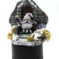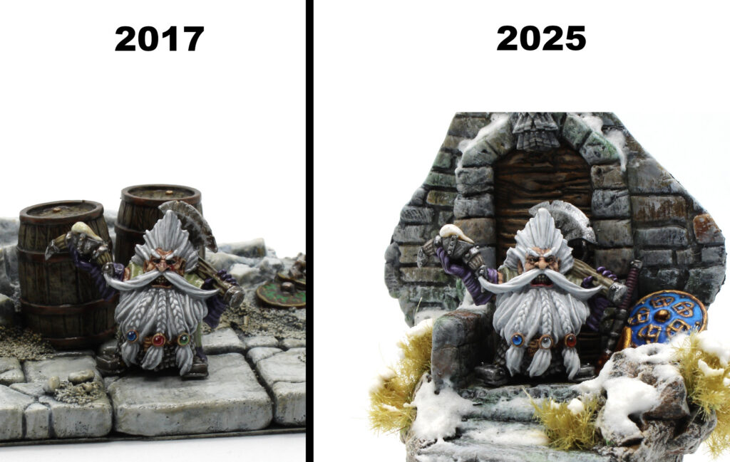 Au final, j’ai une peinture plus fine sur les détails, des traits plus net, des dégradés mieux fondus et des couleurs plus éclatantes. Ce que je trouve être un net progrès et dont je suis bien plus satisfait. La composition de l’ensemble me semble également mieux réalisée. La première version montrait un lieux en ruines sur un ensemble très large et étalé, sans dimensions verticales, dans lequel notre cher nain était un peu noyer avec les divers éléments. Pas très distinguable dans l’ensemble de la construction. La nouvelle production me semble plus harmonieuse avec une dimension verticale légère qui met plus en avant la figurine. Bref c’est bien mieux. Et qui plus est, cela m’a pris moins de temps. Même si je suis un peintre assez lent, cette version m’a pris beaucoup moins de temps. Et bien que ces 3 dernières années, la vie m’ait bien moins laissé le temps pour pratiquer le hobby. J’ai la sensation de continuer à progresser légèrement.