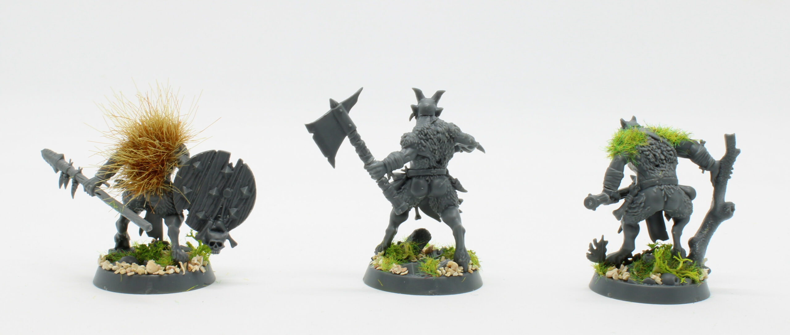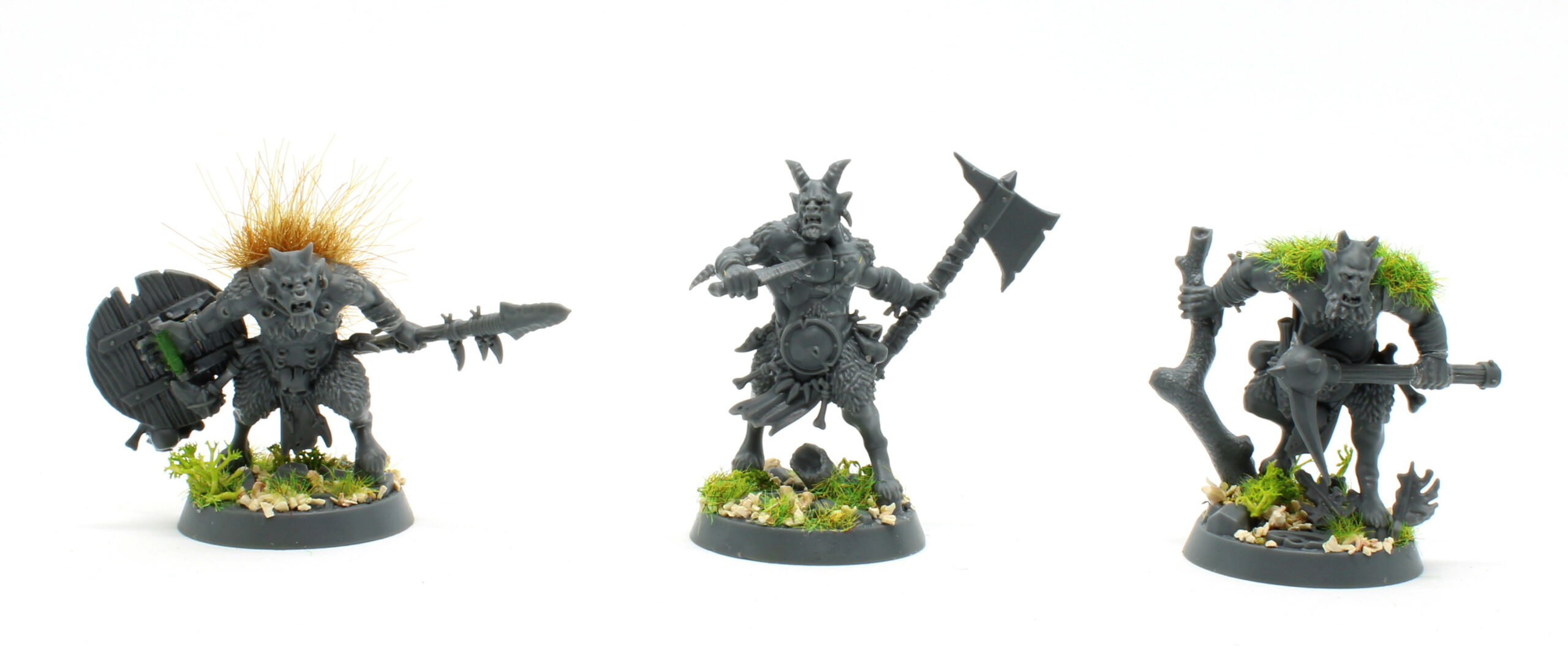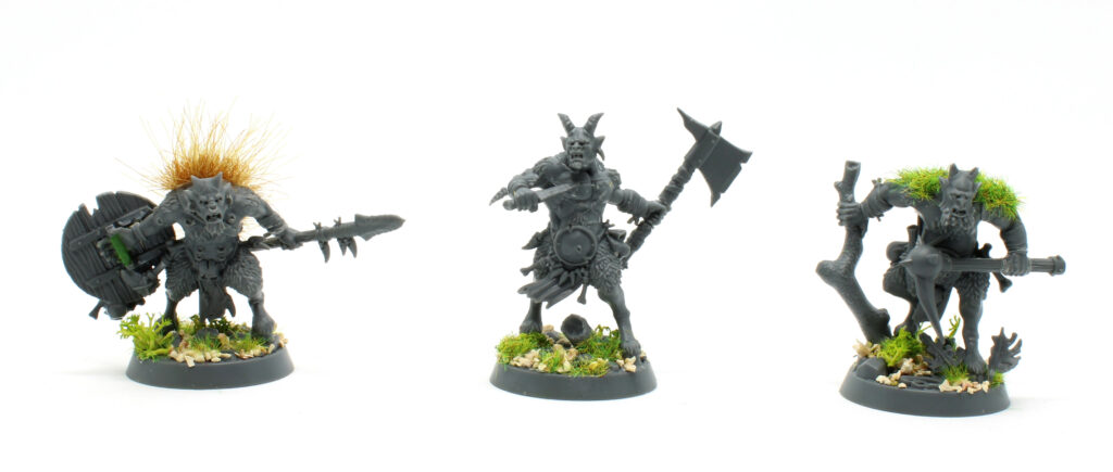 J’ai greenstuffé les raccords sur les zones nécessaires et j’ai travaillé la fourrure de deux d’entre eux pour donner un peu de texture et accentuer le côté Grimdark et bestiale à l’étape de peinture. Pour cela j’ai utilisé de l’herbe statique et une touffe de végétation. Celle-ci a d’ailleurs été parfaite pour masquer le carquois dans le dos qui avait été coupé.