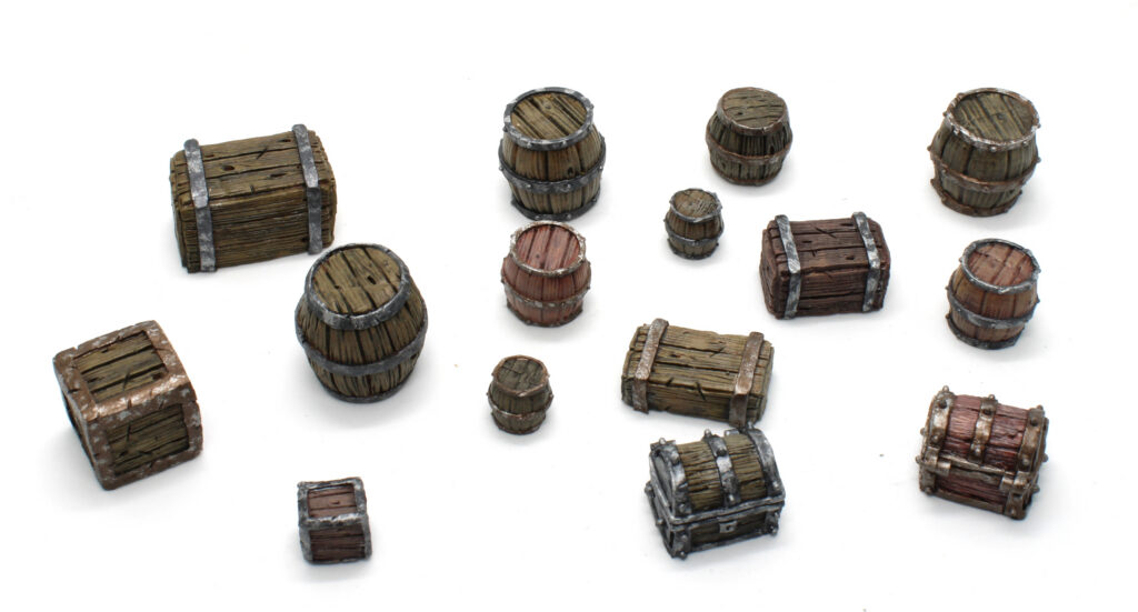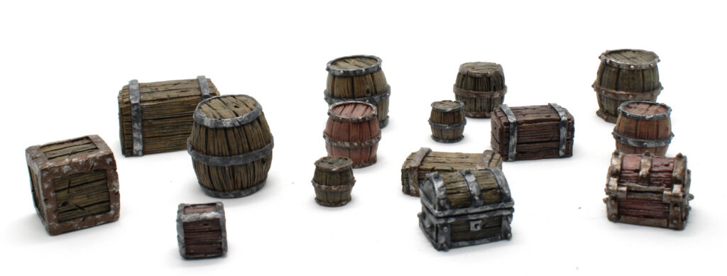 Et toujours chez le même fabriquant et pour une bouché de pain, quelques tonneaux, caisses et coffres pour décorer les bâtiments ou servir de pions d’objectifs durant les parties.