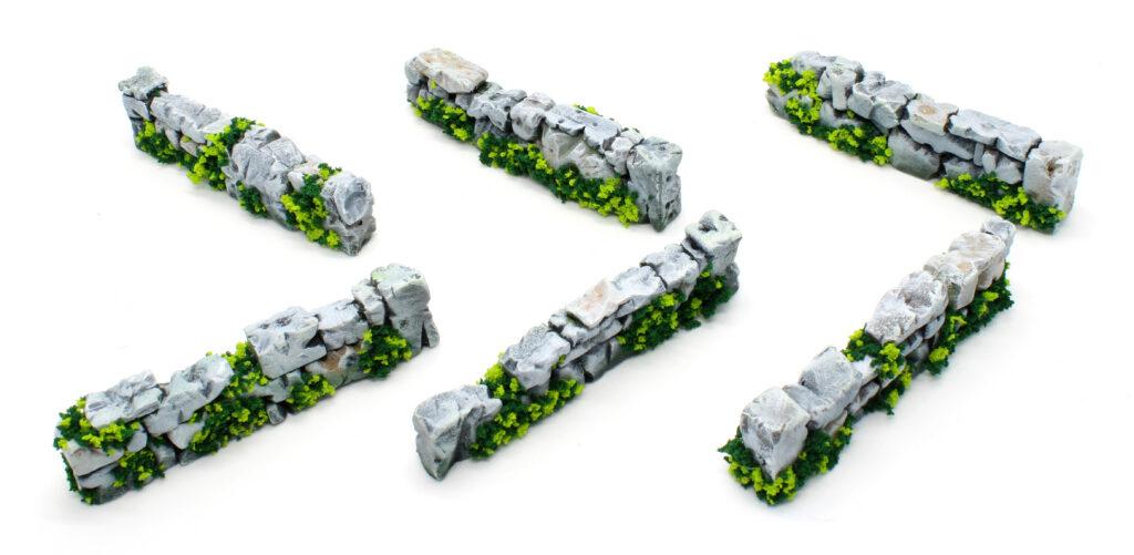 Ces murets ont été peints avec de simples brossage de gris, des lavis de brun et des brossages plus clairs jusqu’au blanc. J’ai ajouté un peu de flocage pour donner un plus de vie à ces petits éléments.