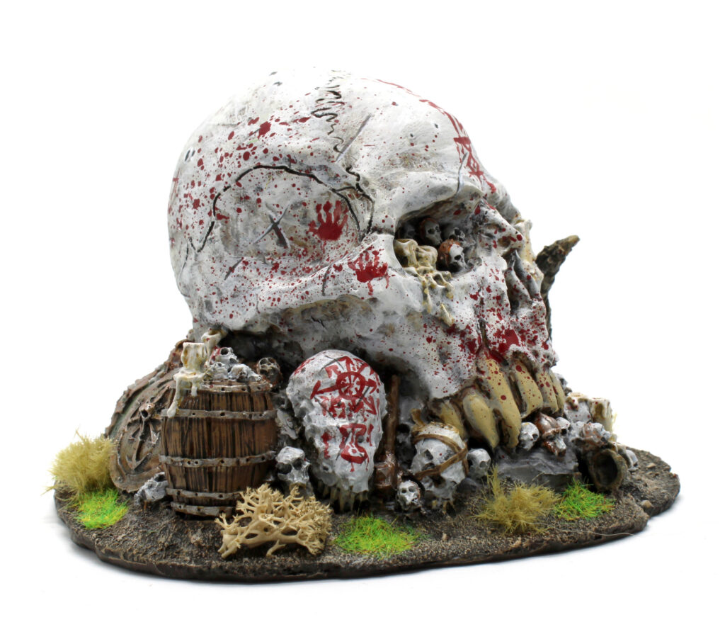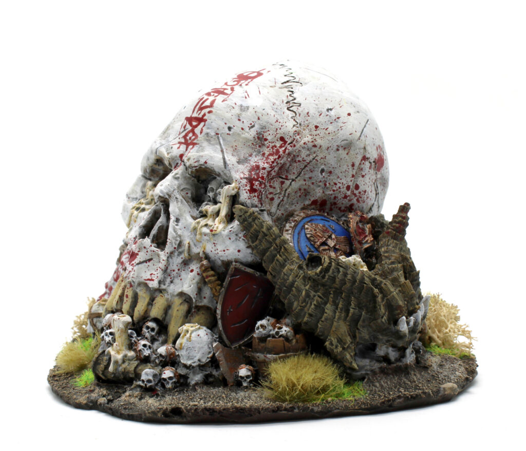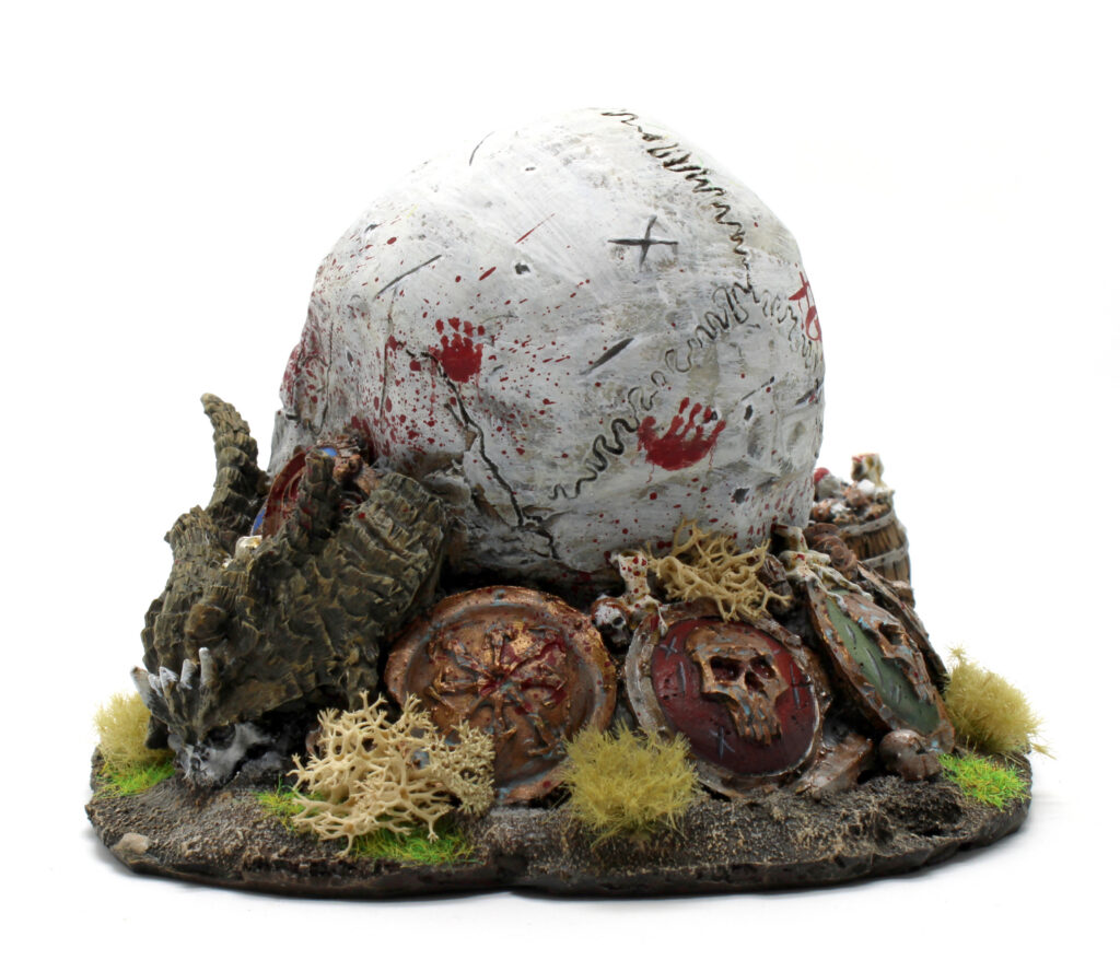 Une très jolie pièce, assez rapidement peinte au final, malgré la présence de pleins de petits détails sur les crânes et boucliers. Le plus technique fut les écritures/mains/éclaboussures de sang sur le crâne à faire à la fin alors que tout était peint. De quoi suer un petit peu !