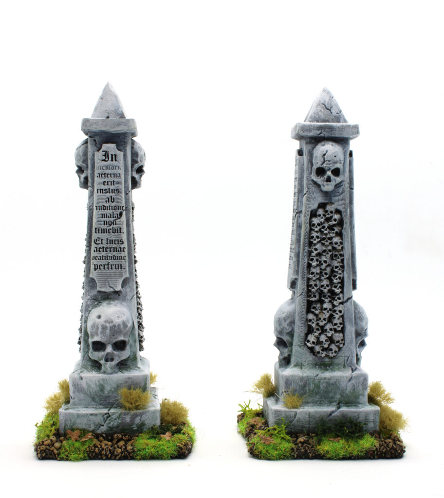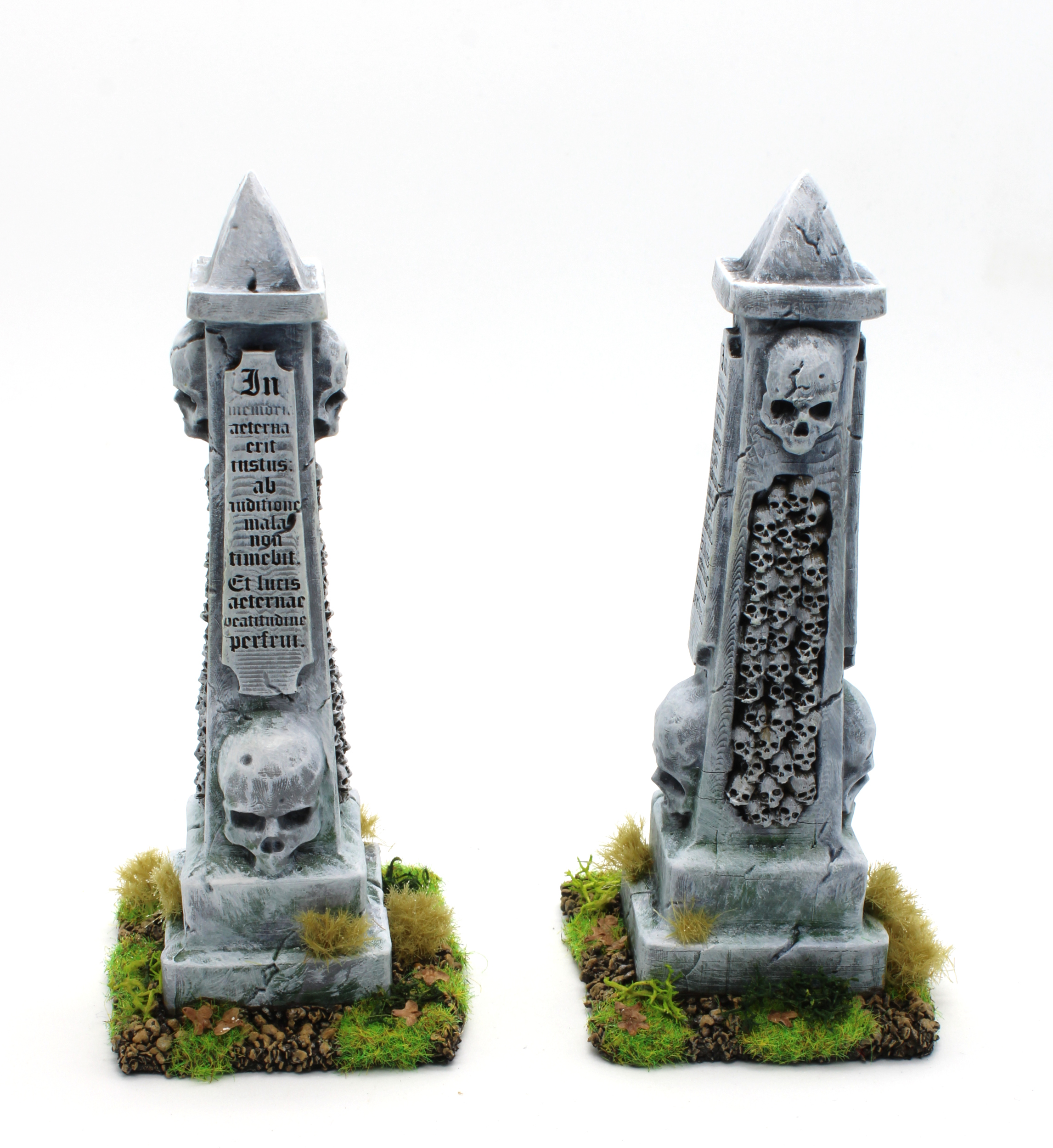 Ces colonnes proviennent de l’ancienne boutique de MomMiniaturas. J’aimais décidément bien ce fabriquant et je regrette son passage à une boutique de STL uniquement. Ces pièces en résines ne coûtaient qu’une bouchée de pain et elles conviennent à de nombreuses tables. Ces monuments peuvent aussi bien convenir pour une table de Warhammer 40000 avec son iconographie pleine de crânes, que pour une table de Warhammer Battle en tant que monuments dédiées au dieu Mórr. Mais encore, elles reste assez passe partout pour de nombreux univers de fantasy.